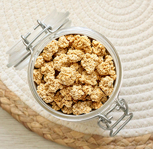 Notre croustillant nature est composé de flocons d'avoine complets et de billettes de céréales.