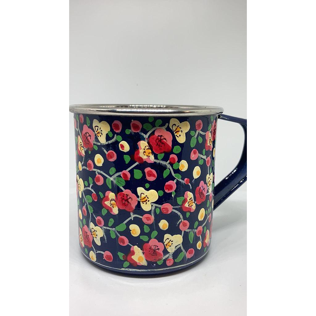 Mug en métal, décoration artisanale à la main, Inde. Fond bleu marine, petites fleurs. #cdvnoumea