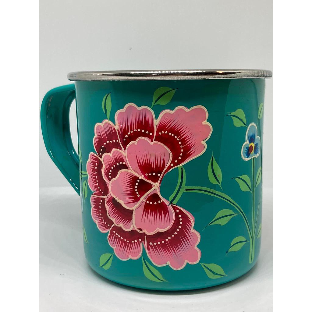 Mug en métal, décoration artisanale à la main, Inde. Fond vert turquoise, grosse fleur rose. #cdvnoumea