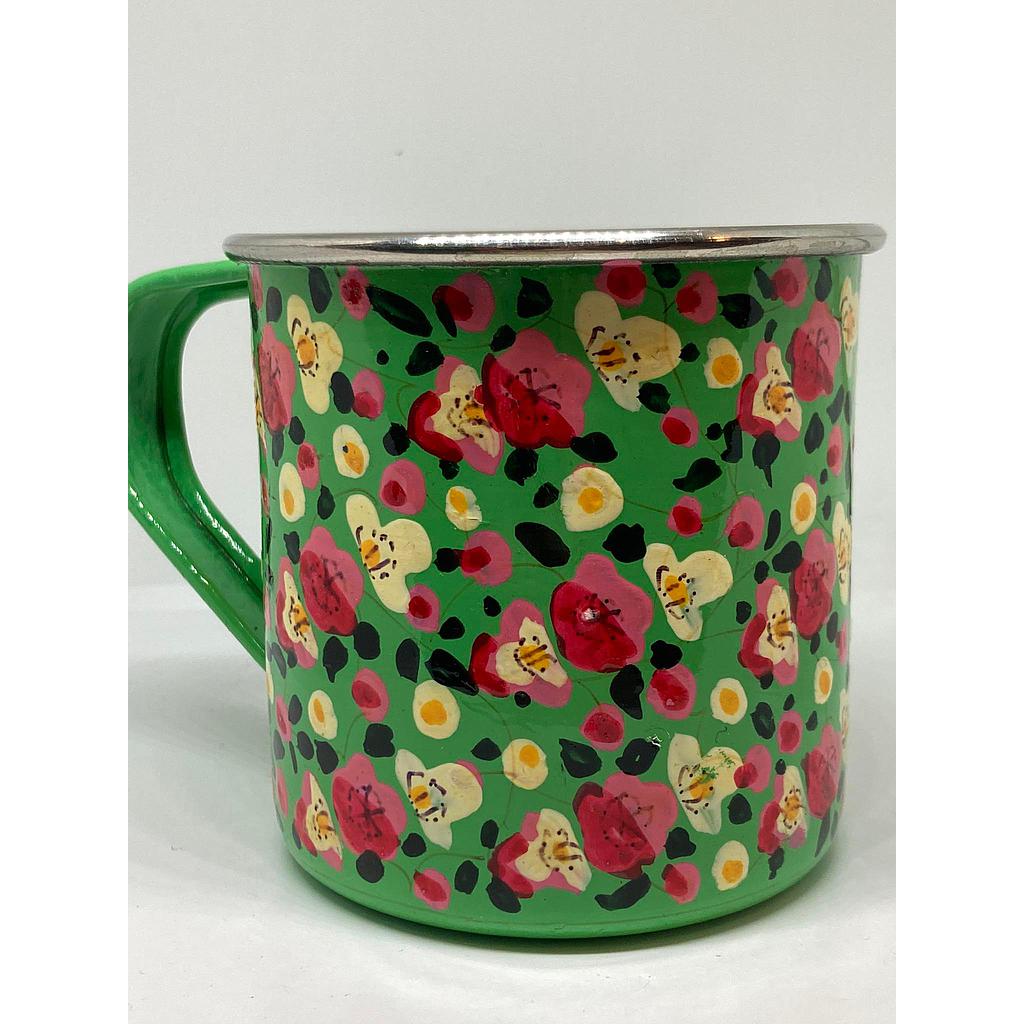 Mug en métal, décoration artisanale à la main, Inde. Fond vert tendre, petites fleurs. #cdvnoumea