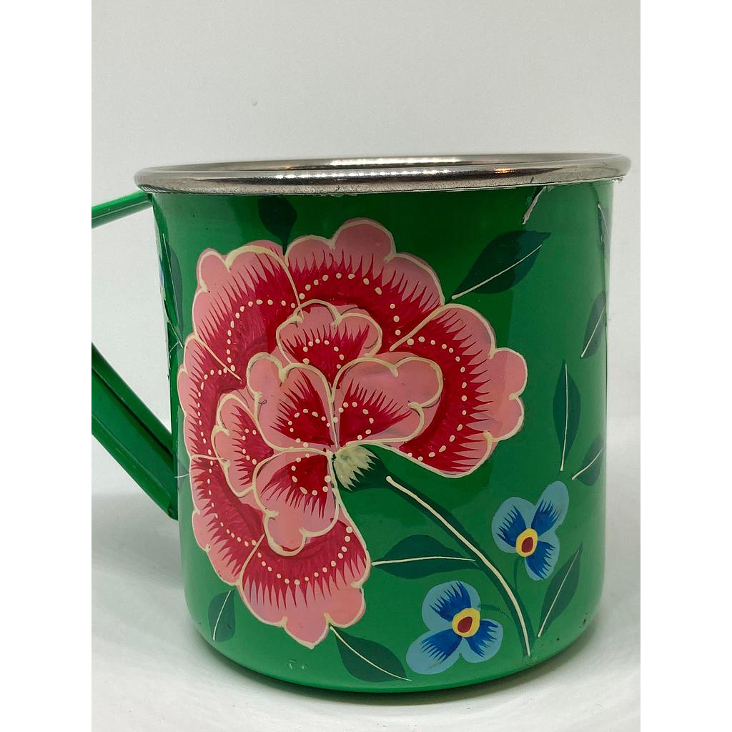 Mug en métal, décoration artisanale à la main, Inde. Fond vert tendre ,très grosse fleur rose. #cdvnoumea
