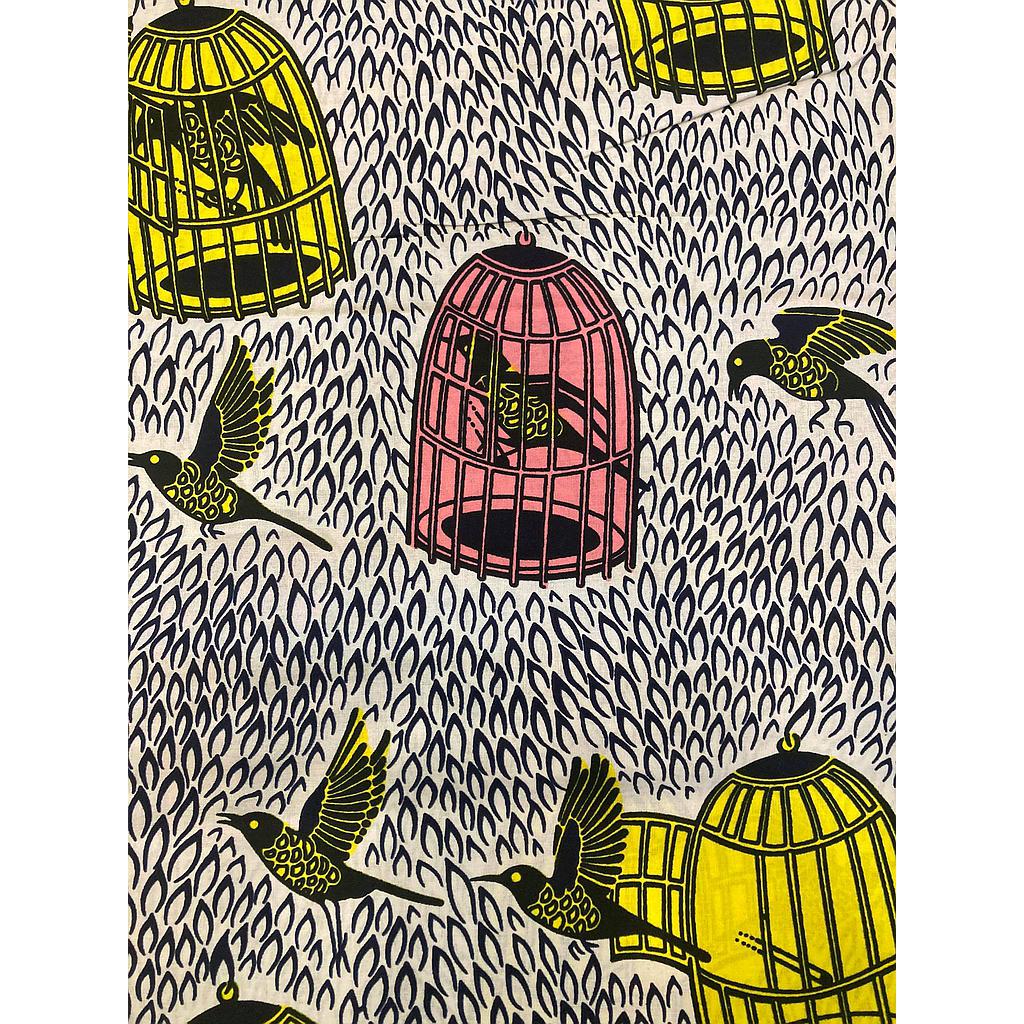 Tissus Wax - Cage oiseaux jaunes rose fond blanc